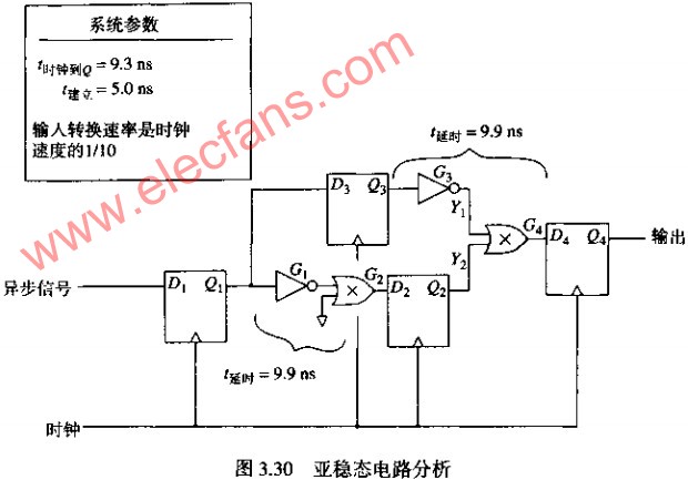 2 亞穩(wěn)態(tài)的概念 亞穩(wěn)態(tài)是指觸發(fā)器無法在某個規(guī)定時間段內(nèi)達(dá)到一個可確認(rèn)的狀態(tài)。當(dāng)一個觸發(fā)器進(jìn)入亞穩(wěn)態(tài)引時,既無法預(yù)測該單元的輸出電平,也無法預(yù)測何時輸出才能穩(wěn)定在某個正確的電平上。在這個穩(wěn)定期間,觸發(fā)器