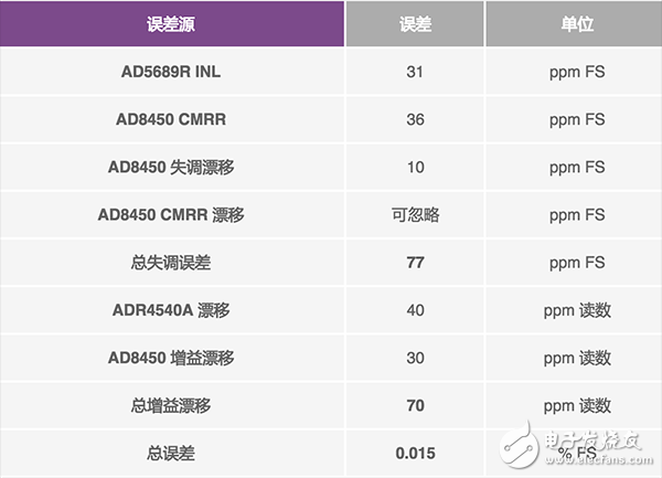 最后,電流檢測放大器的增益漂移最大值為3 ppm/°C,而總漂移為30 ppm(10°C 范圍內(nèi))。檢測電阻漂移為15ppm/°C,因此總共增加150 ppm 增益漂移(10°C 范圍內(nèi))。表3 總結(jié)了這些誤差 源,它們產(chǎn)生的總滿量程誤差不足0.04%。該誤差很大一部分來源于分流電阻,因此必要時可以采用漂移值較低的分流電阻,以改善系統(tǒng)精度。