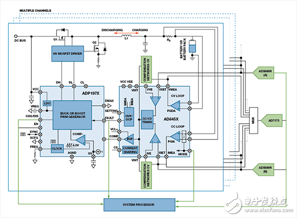 圖6 中的電池測試系統(tǒng)采用模擬控制環(huán)路。兩個DAC 通道控制CC 和CV 設(shè)定點。AD8450/AD8451 用于電池測試與化成系統(tǒng)的精密模擬前端和控制器可測量電池電壓和電流,并與設(shè)定點進(jìn)行比較。CC 和CV 環(huán)路決定MOSFET 功率級的占空比模式從充 電變?yōu)榉烹姾?,測量電池電流的儀表放大器的極性轉(zhuǎn),以保證 其輸出為正,同時在CC 和CV 放大器內(nèi)部切換可選擇正確的補償網(wǎng)絡(luò)。整個功能通過單引腳利用標(biāo)準(zhǔn)數(shù)字邏輯控制。