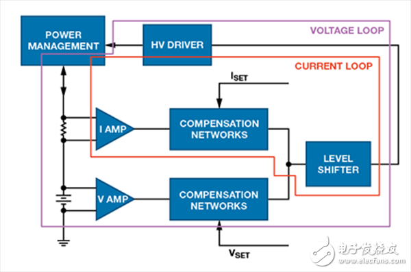 一個系統(tǒng)需要四個不同的控制環(huán)路,這些環(huán)路可在模擬域或數(shù)字域中實現(xiàn):恒流(CC)充電、CC 放電、恒壓(CV)充電和CV 放電。需干凈地切換CC 和CV 模式,無毛刺或尖峰。
