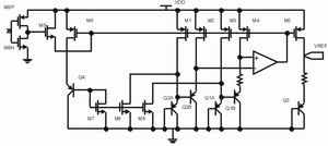 一種高精度電流源的電路,是通過V/I變換,將由帶隙基準電壓電路產(chǎn)生的與溫度和電源電壓無關(guān)的帶隙基準電壓轉(zhuǎn)換成與溫度和電壓無關(guān)的高精度基準電流,并通過高精度電流鏡結(jié)構(gòu)產(chǎn)生所需的鏡像電流,有效地抑制了由于 溫度、電源電壓、負載阻抗的變化及干擾對電流源的影響。