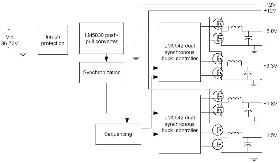 圖 2 中顯示了此類型的 50W 六輸出 DSL 電源的示例。使用 LM5030 推挽變換器隔離并將 – 48V 輸入轉(zhuǎn)換至 +/-12V(每個(gè) 1A),+12V 輸出經(jīng)一對(duì) LM5642 雙同步控制器,產(chǎn)生四個(gè)電壓;+3.3V @ 2.6A、5V @ 1.2A、1.8V @ 1A 和 1.5V @ 7.7A。此結(jié)構(gòu)可確保對(duì)所有輸出進(jìn)行有效穩(wěn)壓,并且獲得良好的總體效率。