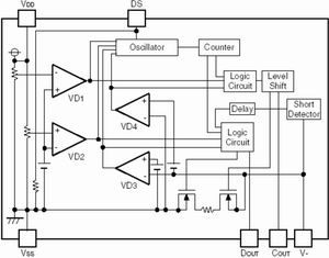 電壓,而低于短路檢測(cè)電壓時(shí),芯片進(jìn)入放電過(guò)電流保護(hù)狀態(tài);當(dāng)V-端電壓高于短路檢測(cè)電壓時(shí),芯片進(jìn)入短路保護(hù)狀態(tài)。此時(shí),DOUT端輸出由高電位變?yōu)榈碗娢?,關(guān)斷MD防止電路中通過(guò)強(qiáng)電流?! D1中,R1和C1
