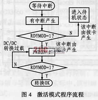 對于激活模式,當(dāng)MC33560被選中后,RDYMOD引腳將變?yōu)檩敵?,此時可以查詢MC33560的狀態(tài)。如果發(fā)現(xiàn)有卡,則啟動DC/DC轉(zhuǎn)換器。然后繼續(xù)查詢RDYMOD引腳以檢測是否成功進(jìn)行了DC/DC轉(zhuǎn)換。該過程的流程圖如圖4所示。下面是其程序代碼: