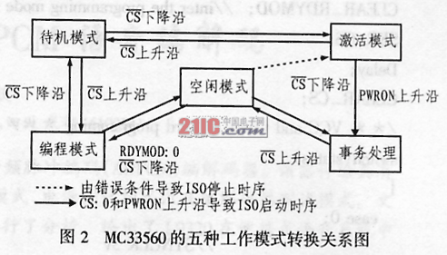 MC33560共有待機模式、編程模式、激活模式、事務(wù)處理模式和空閑模式等五種工作模式,其中待機模式為無卡時的工作模式;編程模式為對MC33560進(jìn)行編程操作時的模式;而在激活模式下,用戶可以查詢卡的狀態(tài)并進(jìn)行DC/DC轉(zhuǎn)換;在事務(wù)處理模式下?MC33560會保持加到卡上電源和選中的時鐘信號,并根據(jù)電源電壓在微處理器 和卡之間進(jìn)行IO、RESET、C4、C8等引腳的信號電平轉(zhuǎn)換;空閑模式指的是卡已上電,但沒有進(jìn)行數(shù)據(jù)傳輸時的狀態(tài)。圖2所示是五種工作模式之間的轉(zhuǎn)換關(guān)系圖。4 應(yīng)用設(shè)計