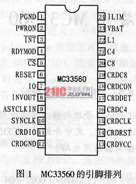 MC33560具有SO-24和TSSOP-24兩種封裝形式,全部管腳可以分為控制器 接口引腳、智能卡接口引腳及電流限制和熱保護(hù)引腳等三部分。其引腳排列見圖1。