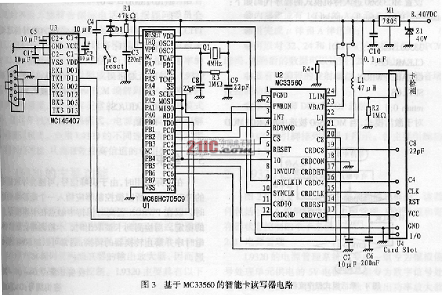 圖3所示是用MC33560智能卡讀寫器接口電路和MC68HC705C9微控制器構(gòu)成的智能卡讀寫器的硬件應(yīng)用電路。