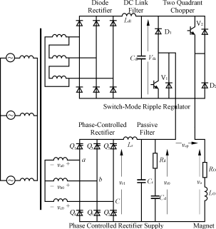 圖4串聯(lián)斬波方式的直流有源電力濾波器 流的目的。這里,直流有源電力濾波器相當(dāng)于電流控制電流源(CCCS)的逆變器。也可以檢測整流器經(jīng)平波電抗器后的輸出電壓,如圖2所示,通過低通濾波器將紋波電壓分離出來,用此信號控制直流有源電力濾波器的輸出電流iah,使直流負(fù)載上的紋波電流分流,同樣可以達(dá)到降低直流負(fù)載中紋波電流的目的。在這種情況下,雖然直流有源電力濾波器在理論上不能徹底消除負(fù)載端的紋波電流,但可以使其大幅度地衰減。這時,直流有源電力濾波器相當(dāng)于電壓控制電流源(VCCS)的逆變器。 從上面介紹的直流有源電力濾波器的工作原理可以看出,串聯(lián)直流有源電力濾波器所抑制的是紋波電壓,它通過全額負(fù)載電流。當(dāng)負(fù)載電流較大時,直流有源電力濾波器必須采用多個器件并聯(lián)運(yùn)行,損耗也比較大,這是它的缺點(diǎn)。串聯(lián)直流有源電力濾波器比較適合于對紋波電流要求低的電感量較小或純阻性的直流負(fù)載。 并聯(lián)直流有源電力濾波器通過使諧波源產(chǎn)生的諧波電流分流達(dá)到抑制直流負(fù)載紋波的目的,它承受全額負(fù)載電壓。而在穩(wěn)定/脈沖直流電源中,這個電壓不會太高,器件完全能夠承受。當(dāng)紋波電流比較低時,用較小的紋波電流來控制直流有源電力濾波器比較困難,這時宜采用檢測紋波電壓來控制直流有源電力濾波器,使紋波電流分流[5]。并聯(lián)直流有源電力濾波器比較適合于電感量較大直流負(fù)載。 3直流有源電力濾波器的典型拓?fù)浼捌鋺?yīng)用 文獻(xiàn)[1]采用變壓器—電抗器式串聯(lián)直流有源電力濾波器研制的高穩(wěn)定度大功率脈沖電源,其輸出的主要技術(shù)指標(biāo)為:電壓220V,電流0~6500A,電源長期穩(wěn)定度達(dá)到100mA,輸出紋波電流峰?峰值30mA,最大的電流變化率達(dá)到±20kA/s,最大的電壓變化率達(dá)到±12kV/s。電源結(jié)構(gòu)如圖3所示。借助于直流有源電力濾波器,達(dá)到了既大幅度地衰減負(fù)載電流紋波,又能對負(fù)載電流、電壓進(jìn)行高速控制的目的。 文獻(xiàn)[2]提出了一種適合于離子加速器磁鐵負(fù)載的新型電源,如圖4所示。該電源系統(tǒng)由工作于開關(guān)方式的電流紋波調(diào)節(jié)器(SMRR)和一相控整流器(PRS)組成。SMRR由許多IGBT并聯(lián)而成,采用斬波電路原理,串在相控整流器的輸出電路中作為直流有源電力濾波器使用。它濾除了PRS輸出電壓中的諧波,尤其是低次諧波和非特征諧波。該系統(tǒng)供給磁鐵負(fù)載的電流紋波系數(shù)能夠達(dá)到1×10-5,同時還具有系統(tǒng)響應(yīng)快、成本低的特點(diǎn)。 文獻(xiàn)[3]提出了直流有源電力濾波器與負(fù)載主電路并聯(lián)聯(lián)結(jié)的1kVA試驗(yàn)電源裝置,如圖5所示。該系統(tǒng)采用檢測紋波電流的控制方法,直流有源電力濾波器不但用于消除負(fù)載電流紋波,而且還可用于補(bǔ)償輸出電流脈沖的跟蹤誤差。試驗(yàn)結(jié)果表明,該直流有源電力濾波器能夠使負(fù)載紋波電流衰減到1/100。 文獻(xiàn)[4]提出了利用共用的直流母線電源,在交流側(cè)并聯(lián)有源電力濾波器抑制交流側(cè)的諧波電流,而在直流側(cè)串聯(lián)直流有源電力濾波器消除直流側(cè)諧波電壓的結(jié)構(gòu),如圖6所示。采用直流有源電力濾波器可望在整流器中代替體積大、造價(jià)高的平波電抗器。