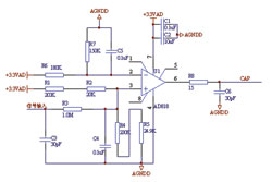 信號(hào)預(yù)處理模塊主要包括四階低通濾波電路和同步方波變換電路。根據(jù)國(guó)家對(duì)諧波測(cè)量?jī)x器的要求,A級(jí)儀器頻率測(cè)量范圍是0~2500Hz,故每周波每路采樣128點(diǎn)。根據(jù)工程經(jīng)驗(yàn),采用截止頻率為1500Hz的四階巴特沃斯低通濾波器,完全可以達(dá)到較好的濾波效果。同時(shí)為了提高測(cè)量精度,采用了自適應(yīng)調(diào)整采樣間隔技術(shù),即根據(jù)捕獲單元測(cè)量的頻率自動(dòng)調(diào)整。本系統(tǒng)采用同步方波變換電路部分實(shí)現(xiàn)頻率的測(cè)量,同時(shí)為提高共模抑制比,同步方波變換電路采用開(kāi)環(huán)方式實(shí)現(xiàn)電壓比較并將其輸入到同相端,同時(shí)在反相端輸入? +1.5V的比較電平,這樣在輸出端即引腳6處可得到占空比為50%的方波,其中電容C5起抑制高頻噪聲的作用。同步方波變換電路圖如圖3所示。