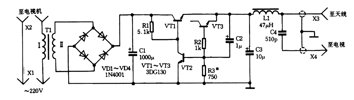 下圖是—個(gè)簡(jiǎn)單的單管電視天線放大器的電原理圖。