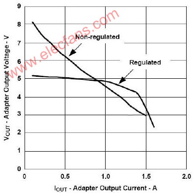 穩(wěn)壓適配器的輸出電壓通過(guò)內(nèi)置電路提供非常優(yōu)良的線路及負(fù)載調(diào)節(jié)。而相反的,非穩(wěn)壓適配器所提供的輸出電壓則取決于負(fù)載,線路負(fù)載調(diào)節(jié)能力不強(qiáng)。適配器在過(guò)電流狀態(tài)下的行為也有所差別。穩(wěn)壓適配器在進(jìn)入過(guò)電流區(qū)域時(shí)通常具有更為陡峭的過(guò)渡區(qū)(transition region),如圖1所示。