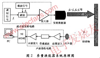 參量換能器系統(tǒng)主要由PC機(jī)、超聲波發(fā)射電路、聲波接收電路、發(fā)射換能器、傳聲器和數(shù)據(jù)采集卡組成。本文擬建立如圖2所示的參量換能器實(shí)驗(yàn)驗(yàn)證系統(tǒng)。其中 超聲換能器和傳聲器是用來實(shí)現(xiàn)超聲波信號發(fā)射和聲波信號接收的裝置;超聲波發(fā)射電路是用來產(chǎn)生一定頻率的載波和調(diào)制信號,通過調(diào)制、放大后驅(qū)動換能器發(fā)射 出超聲波信號;聲波接收電路是用來對回波信號進(jìn)行放大、濾波等調(diào)理,以便送人數(shù)據(jù)采集卡,然后由計(jì)算機(jī)進(jìn)行數(shù)據(jù)處理。