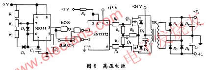 高壓電源設(shè)計(jì)中,由NE555組成的電路提供脈沖信號,SN75372集成芯片是雙通道與非門TTL/MOS專用接口電路,其中管腳2是兩個(gè)與非門公用的 使能輸入端(高電平有效),管腳1/7和管腳3/6分別是兩個(gè)與非門的輸入/輸出端;管腳4是數(shù)字地;管腳8接5 V直流電源,管腳5接15 V直流電源。利用該接口電路,就可以直接用TTL電平來驅(qū)動MOSFET功率管。R4與R5構(gòu)成分壓電路,用來確定MOSFET功率管IRF520的柵源 電壓VGS,進(jìn)而控制功率管導(dǎo)通時(shí)的漏極電流ID;RS是限流電阻,用于限制漏級電流ID的大小,它可以使功率管導(dǎo)通時(shí)的最大漏級電流IM基本恒定,避免 功率管導(dǎo)通瞬間過大的電流沖擊。該電路通過變壓器輸出后,將橋式整流電路變壓器副邊中點(diǎn)接地,再接上濾波電容,并且兩個(gè)電容的中點(diǎn)接地,可以得到較高的 正、負(fù)直流輸出電壓,滿足實(shí)驗(yàn)中高壓電源的需求。