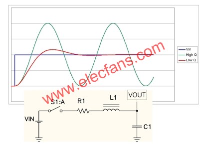 高Q(低阻尼)系統(tǒng)為無(wú)阻尼,而濾波器輸出電壓可振鈴至兩倍輸入源 (Vin)。低Q系統(tǒng)會(huì)限制峰值振鈴電壓。