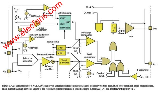 應(yīng)用通常推動著PFC控制器的設(shè)計(jì)。例如安森美半導(dǎo)體的NCL30001 LED照明控制器,該器件主要用于40W和150W之間的12V及12V以上LED照明應(yīng)用,它整合了CCM PFC和一個回掃降壓型轉(zhuǎn)換器(圖5)。
