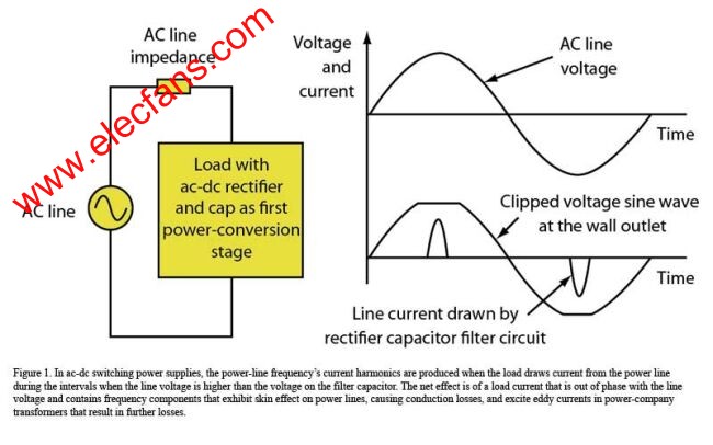那么這些諧波失真來自哪里呢?一個常見的誤解是開關(guān)穩(wěn)壓器導(dǎo)致了諧波功率因數(shù)分量。事實(shí)上,諧波分量是在典型的全橋整流器和濾波電容器中產(chǎn)生的,電力線本身的阻抗則起著推波助瀾的作用。