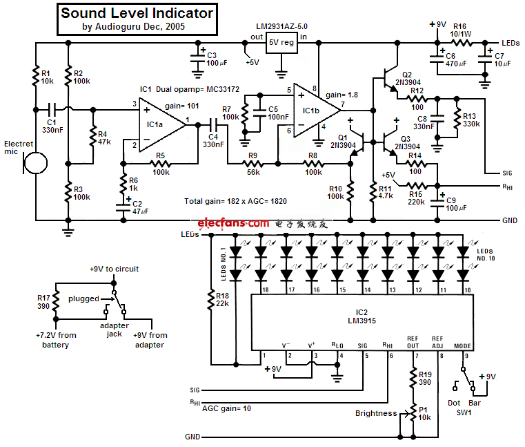 這個漂亮的聲級計是一個完美的芯片更換為標(biāo)準(zhǔn)的模擬儀表。整個電路是基于LM3915的音頻電平IC,只使用很少的外部元件。