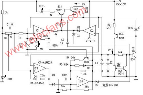 電路焊接無誤后,一般可正常工作,否則應(yīng)檢查IC4的輸出端有無矩形脈沖輸出.若IC4輸出正常,可檢查BG3、BG4是否損壞.若IC4無矩形波輸出,則可按四個運放及其周圍的電路分為4個功能模塊.通過考察各個運放的輸出,逐個排除故障。注意:應(yīng)調(diào)整R1到適當(dāng)阻值,調(diào)整W1可改變兩種不同頻率充電的切換點。