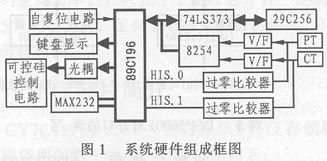 本電網(wǎng)無功功率補償控制系統(tǒng)的硬件組成框圖如圖1所示。它主要有單片機系統(tǒng)(由80196單片機、74LS373、FLASH MEMERY 29C256組成的自復位電路)、鍵盤顯示電路、輸入電路、輸出電路和通信接口電路MAX232等部分組成。