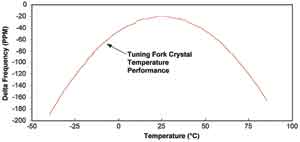 溫度的不穩(wěn)定和相應(yīng)的溫度系數(shù)是許多應(yīng)用所面臨的問題,特別是那些工作在寬溫范圍的應(yīng)用,如室外電表或水表。標準的用作RTC時基的32.768kHz音叉晶體的頻率響應(yīng)與溫度之間的關(guān)系為Δf/f=k(T-T0)2+f0。其中,Δf為頻率偏差,f為基頻,k為曲率,T為溫度,T0為折點溫度,f0為折點溫度處的頻偏。