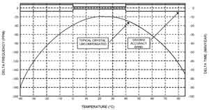 消除溫度對精度影響的唯一途徑是提供實時的溫度補償。校準程序要準確測量晶體/振蕩器隨溫度的變化情況,并存儲結(jié)果。然后按照一定的時間間隔測量晶體溫度,利用存儲的校準信息調(diào)節(jié)溫度效應(yīng)。