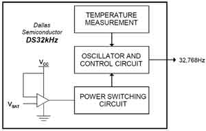 本節(jié)將以Maxim公司的DS32kHz溫補晶體振蕩器為例,介紹通過改變晶體負載電容修正由于溫度變化產(chǎn)生的頻偏的概念,如圖2所示,Maxim的這項內(nèi)部校準技術(shù)還獲得了專利。DS32kHz可以作為大多數(shù)系統(tǒng)的32kHz輸入,如RTC或內(nèi)置RTC的微控制器。