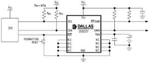 如圖5所示,典型的DS3231應(yīng)用電路內(nèi)部集成了晶體,其他電路類似于普通RTC,設(shè)計人員無須考慮分立晶體的選擇和布板。因為DS3231包含經(jīng)過溫度補償校準的振蕩器,可顯著提高RTC的初始精度和溫度穩(wěn)定性。由于內(nèi)嵌在封裝內(nèi)的晶體已經(jīng)經(jīng)過高溫老化處理,DS3231與分立的晶體相比具有更好的長期穩(wěn)定性。精度可以達到±2×10-6,溫度范圍0~+40℃。