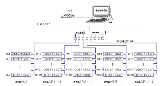 ????? 配電系統(tǒng)一次方案圖列出了總配電箱及宿舍一層照明箱配電箱的支路數(shù)及各支路電能表的型號。為滿足智能化監(jiān)測及遠(yuǎn)程自動抄表需要,該電能管理系統(tǒng)采用RS485總線,將安裝于總配電箱AL1總進(jìn)線的1臺ACR230ELH多功能電力儀表、安裝于WL1~WL7及各樓層公共浴室的11臺DTSF1352三相導(dǎo)軌式電度表及安裝于宿舍樓各樓層的108臺DDSF1352單相導(dǎo)軌式電度表(27×4層宿舍樓)進(jìn)行集中組網(wǎng),監(jiān)控中心配置監(jiān)控計(jì)算機(jī)、打印機(jī)、通訊服務(wù)器及必要的輔助設(shè)備,安裝電能管理系統(tǒng)EMS軟件完成對各臺電能表的遠(yuǎn)程采集和數(shù)據(jù)的集中處理。電能管理系統(tǒng)圖見圖5。