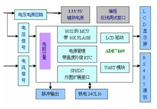 ????? DDSF1352單相復(fù)費(fèi)率電能表采用ADI公司最新技術(shù)ADE7169F16片上系統(tǒng)的單芯片設(shè)計(jì)完成。ADE7169集成了高精度計(jì)量單元模塊和8052的MCU及其外圍模塊,計(jì)量模塊計(jì)量精度高、能測量各相電流、電壓有效值、各相及總的有功功率、無功功率、電網(wǎng)頻率等運(yùn)行參數(shù),過載倍數(shù)大。片上8052的MCU帶有16K FLASH和512B RAM和多種外設(shè)模塊,支持低功耗溫度補(bǔ)償?shù)钠蟁TC模塊、LCD驅(qū)動模塊、電源管理模塊、SPI/I2C接口模塊和UART通訊模塊等,用一片ADE7169就能實(shí)現(xiàn)單相復(fù)費(fèi)率多功能電能表設(shè)計(jì)。具體設(shè)計(jì)框圖如圖2。