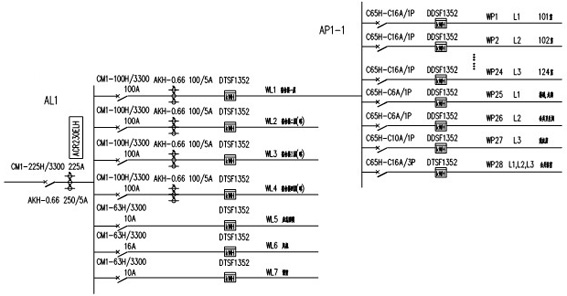 ????? 以某理工大學(xué)學(xué)生宿舍樓為例。該樓有4層,每層有24間宿舍,配有公共衛(wèi)生間、洗衣房、公共浴室,電氣一次方案見圖4。總配電箱進(jìn)線回路安裝有屏裝式ACR230ELH多功能電力儀表,計(jì)量宿舍總電量。包括三相有功電度、無功電度、功率、功率因數(shù)、電流、電壓、頻率以及分相電量等共34項(xiàng)電參量。電流、電壓2~31次分次諧波分量,電流、電壓不平衡度,電流、電壓正、負(fù)零序分量檢測和分析。每個(gè)樓層、應(yīng)急照明、風(fēng)機(jī)、預(yù)留電氣干線分別由7臺DTSF1352電表負(fù)責(zé)計(jì)量三相有功電度,電表可與CM1斷路器對應(yīng)并列導(dǎo)軌式安裝,也可集中安裝在箱內(nèi)上方。每一樓層的宿舍房間、公共衛(wèi)生間、洗衣房、走廊電能由27臺單相電表DDSF1352負(fù)責(zé)計(jì)量,公共浴室由1臺三相DTSF1352計(jì)量。