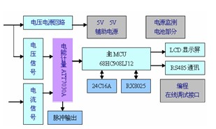 ????? DTSF1352 三相電子復(fù)費(fèi)率電能表采用計(jì)量芯片ATT7030A和飛思卡爾公司的8位單片機(jī)M68HC908LJ12實(shí)現(xiàn)。其原理為:線路上實(shí)時(shí)電壓、電流經(jīng)高精度互感器耦合,采樣電路分別采樣后,送到電量計(jì)量專用芯片ATT7030A(A/D轉(zhuǎn)換器轉(zhuǎn)化成數(shù)字信號,通過片內(nèi)專用DSP運(yùn)算后輸出電能脈沖),通過脈沖送到MCU中,并根據(jù)預(yù)先設(shè)定的時(shí)段完成分時(shí)有功、無功電量計(jì)量和最大需量計(jì)算,分別作出相應(yīng)處理,并存貯到EEPROM中;同時(shí)實(shí)現(xiàn)顯示和輸出、RS485串行數(shù)據(jù)傳輸。具體設(shè)計(jì)框圖如圖3。