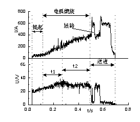 螺柱送進階段,可以分為有弧時間和無弧時間。圖中所示t3時間段表明,螺柱在開始送進階段,電弧仍舊正常燃燒。經過一段時間后,焊接電流急劇升高,而電壓降到不足以維持電弧燃燒。此時處于無弧狀態(tài),直到焊接過程結束。