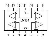 LM324是四運(yùn)放集成電路,它采用14腳雙列直插塑料封裝,外形如圖所示。它的內(nèi)部包含四組形式完全相同的運(yùn)算放大器, 除電源共用外,四組運(yùn)放相互獨(dú)立。每一組運(yùn)算放大器可用圖1所示的符號(hào)來(lái)表示,它有5個(gè)引出腳,其中“+”、“-”為兩個(gè)信號(hào)輸入端,“V+”、“V-”為正、負(fù)電源端,“Vo”為輸出端。兩個(gè)信號(hào)輸入端中,Vi-(-)為反相輸入端,表示運(yùn)放輸出端Vo的信號(hào)與該輸入端的位相反;Vi+(+)為同相輸入端,表示運(yùn)放輸出端Vo的信號(hào)與該輸入端的相位相同。LM324的 引腳排列見(jiàn)圖2