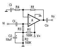 見(jiàn)附圖。同相交流放大器的特點(diǎn)是輸入阻抗高。其中的R1、R2組成1/2V+分壓電路,通過(guò)R3對(duì)運(yùn)放進(jìn)行偏置。電路的電壓放大倍數(shù)Av也僅由外接電阻決定:Av=1+Rf/R4,電路輸入電阻為R3。R4的阻值范圍為幾千歐姆到幾十千歐姆。