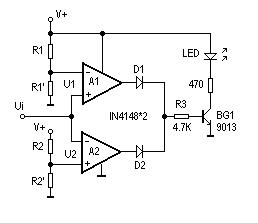 附圖中使用兩個(gè)運(yùn)放組成一個(gè)電壓上下限比較器,電阻R1、R1ˊ組成分壓電路,為運(yùn)放A1設(shè)定比較電平U1;電阻R2、R2ˊ組成分壓電路,為運(yùn)放A2設(shè)定比較電平U2。輸入電壓U1同時(shí)加到A1的正輸入端和A2的負(fù)輸入端之間,當(dāng)Ui >U1時(shí),運(yùn)放A1輸出高電平;當(dāng)Ui<U2,則當(dāng)輸入電壓Ui越出[U2,U1]區(qū)間范圍時(shí),LED點(diǎn)亮,這便是一個(gè)電壓雙限指示器。