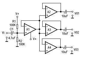 R1、R2組成1/2V+偏置,靜態(tài)時(shí)A1輸出端電壓為1/2V+,故運(yùn)放A2-A4輸出端亦為1/2V+,通過(guò)輸入輸出電容的隔直作用,取出交流信號(hào),形成三路分配輸出。