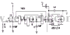 圖2 加防抖觸發(fā)器 圖3中按鈕K未動作時,控制端一定為穩(wěn)定的高電平,一旦按鈕按下,A點電位經(jīng)電容C1通過電阻R1放電,到74HC00的輸入低電平門限值,B點即為邏輯高,同時通過F點控制E點電平(D點原為高電平)翻轉(zhuǎn)為低,啟動X9511動作,此時由于電容C2電位不會立即變化,使D點保持原高電平不變,電容C2通過R2放電,經(jīng)過一個暫態(tài)時間后到達門電路低電平門限值,使E點恢復(fù)高電平。之后無論按鈕是否保持按下(使D點保持低),還是放開(F點為低),E點都將保持高電平狀態(tài)。在暫態(tài)期間,E點低電平被鎖定,即使電路在A點產(chǎn)生較強的電平抖動,也不會對輸出有任何影響。由于電路在暫態(tài)時間內(nèi)對噪聲具有的屏蔽作用,而控制端低電平時 。