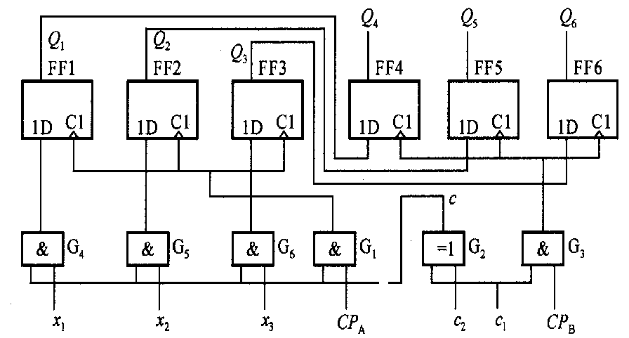 ??? (2)當(dāng)=01時(shí),因c=1,使G4~G6開啟,x1、x2和經(jīng)這些門分別加至D1、D2和D3。同時(shí),CPA經(jīng)G1加到A組各觸發(fā)器,從而在的作用下把外部數(shù)據(jù)? 和 送入A組觸發(fā)器中。此時(shí),因=0,G3關(guān)閉,故B組觸發(fā)器狀態(tài)仍保持不變。