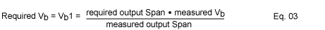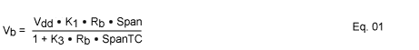 The first part of the calibration process deals with span compensation of the sensor and is concerned with modifying the sensor bridge voltage response. The method employed requires an ideal value of bridge voltage to be determined at each temperature. Pairs of values for the Span and SpanTC DACs, and the corresponding value for bridge voltage, are then found at each temperature. The bridge voltage values generated should be close to the ideal bridge voltage value at the current temperature. Exactly matching values for Vb at each temperature should be avoided. This is because the mathematical solution to the resulting set of equations is in matrix form and will generate a singular matrix in the event that identical values for Vb are used.The process starts at the first calibration temperature (T1) by loading the Span and SpanTC DAC registers with nominal values and measuring the bridge voltage and conditioner IC output span. The value of bridge voltage required at this temperature may be calculated by the expression given in Equation 3.