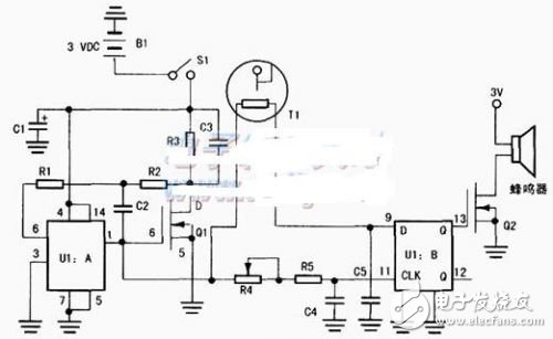 下圖中,電路的U1.A和U1.B的型號(hào)為CD4013B。CDCD4013B是CMOS雙D觸發(fā)器。U1:A與外圍器件構(gòu)成了一個(gè)單穩(wěn)態(tài)的多頻振蕩器,它能夠在U1:A的引腳1處產(chǎn)生一組周期的5s的脈沖輸出。振蕩器的頻率取決于R1和C2的取值。振蕩器通過場效應(yīng)管Q1脈沖傳到U1:R。注意到當(dāng)熱敏電阻上溫度較低時(shí),振蕩器產(chǎn)生的脈;中滯后于時(shí)鐘邊沿,而當(dāng)熱敏電阻T1外溫度較高時(shí)。振蕩器產(chǎn)生的脈沖就會(huì)超前時(shí)鐘脈沖的邊沿,這使得U1:B的輸出會(huì)產(chǎn)生一個(gè)變化,當(dāng)溫度發(fā)生變化并且達(dá)到設(shè)定的初始電壓值時(shí),在U1:B的Q端輸出信號(hào)驅(qū)動(dòng)ZVNI一110A型場效應(yīng)管Q20.該電路由3V、120rnA/h的鋰電池供電,在電路正常工作的情況下它可以連續(xù)使用較長的時(shí)間。