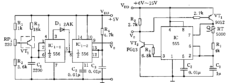 如圖所示,IC1為雙時(shí)基電路556,其中左半(1/2 556)與R3、VT1、c1等組成溫度/頻率變換多諧振蕩器,IC1-2(1/2 556)與R4、c3組成單穩(wěn)觸發(fā)器。VT1采用PNP二極管作為溫度傳感器,當(dāng)溫度在0~100度范圍內(nèi)變化時(shí),由于管子內(nèi)阻隨溫度的變化,使振蕩頻率的變化范圍為3.4kHz~5kHz,線性誤差小于正負(fù)0.5度。IC1的輸出經(jīng)IC2單穩(wěn)觸發(fā)器整形,得到脈寬恒定的矩形波。