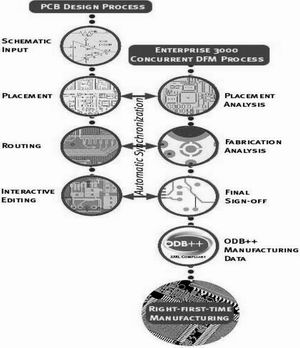 DFM技術(shù)在電子設(shè)計(jì)及電子裝配制造上的應(yīng)用主要通過一定的規(guī)范和流程,輔以專業(yè)化工具來實(shí)現(xiàn)的,圖1表述的就是運(yùn)用DFM技術(shù)、運(yùn)用專業(yè)化工具協(xié)同PCB設(shè)計(jì)的一個(gè)例子,我們可以看到,在電子產(chǎn)品的設(shè)計(jì)中,布線、器件安排都得到了DFM技術(shù)的支持和反饋,最后得到的是“RIGHT-FIRST-TIME"制造,即第一次投入批量生產(chǎn)的產(chǎn)品就是設(shè)計(jì)正確而且合理的產(chǎn)品,擁有相當(dāng)高的一次成品率。