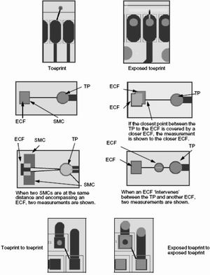同樣,焊盤與板邊的臨界分析、測(cè)試點(diǎn)到裸銅的距離分析、焊盤到焊盤的距離分析(見圖4-6)都是電子裝配產(chǎn)品制造中重要的考慮因素,遵循DFM規(guī)則必然帶來可以預(yù)見的產(chǎn)品收益,反之則是預(yù)見的產(chǎn)品損益。