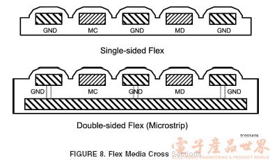 印刷電路板走線、柔性電纜或短的接線都可用作互連的線路。實際的互連線路的類型及配置要視乎系統(tǒng)的實際要求而定,例如互連線路的長短、機(jī)械性能的局限以及電磁兼容性 (EMC) 等要求。柔性電纜是一種成本較低的互連線路,因此經(jīng)常用于小型的電子產(chǎn)品。單面的柔性電纜成本最低,但阻抗一般會較高,而且所提供的屏蔽保護(hù)極為有限。在正常的應(yīng)用情況下,單面柔性電纜已很足夠,可以支持?jǐn)?shù)據(jù)傳輸速度較慢及噪音較少的應(yīng)用系統(tǒng)。雙面的柔性電纜 (即微帶Microstrip ) 可以提供阻抗更易受控制的通道,即使普通的大小也可輕易組成 50W 負(fù)載的線路。此外,這類電纜可為接地層提供屏蔽,若有需要,也可為線跡提供接地保護(hù),這也是雙面柔性電纜的優(yōu)點。系統(tǒng)至少采用三條信號傳輸線路,其中兩條供 MD 和 MC 線路使用,而另外一條是共用接地回流電路。MG 接地應(yīng)在鏈路的兩端連接接地,以便將接地環(huán)路覆蓋面積減至最小。圖 8 所顯示的是單面及雙面柔性電纜的橫切面圖。
