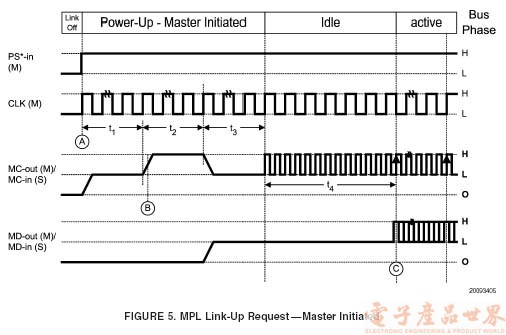基本的 MPL 鏈路由兩條活躍信號線路及一條信號接地回送 (MG) 線路組成。時鐘屬于單向信號,而且一定由主控器提供。數(shù)據(jù)信號 (MD) 與主控器送往從屬芯片的時鐘同步,而主控器傳送時鐘時,會同時利用兩個時鐘邊緣。這樣有助降低時鐘速率,以減低功耗、噪音及電磁干擾。MD 數(shù)據(jù)信號通過半雙工的雙向線路傳送。為了支持?jǐn)?shù)據(jù)輸入 (讀取)的執(zhí)行,數(shù)據(jù)信號可以逆向傳送。以正常的配置為例來說,處理數(shù)據(jù)輸出 (寫入) 時,系統(tǒng)不會為主控器的 MD 接收器及從屬芯片的 MD 線路驅(qū)動器提供供電,以便節(jié)省能源。MD 線路的逆轉(zhuǎn) (TA) 時間較長,以確保線路在必要時有足夠時間通電或斷電。
