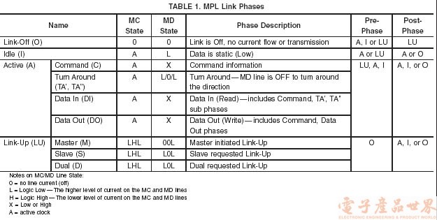 MPL 串行總線分為四個不同的總線階段,每一階段都由 MC 及 MD 線路的狀態(tài)決定,而其中的兩個階段有多個不同狀態(tài)可供選擇。圖表 1 “MPL鏈路的不同階段”顯示 MPL 總線的不同階段。