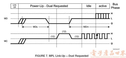 若從屬芯片及主控器同時啟動建立連接請求,便會出現(xiàn)圖 7 所顯示的時間序列。由于所需時間各不相同,因此各時段可能重疊,以這個情況來說,系統(tǒng)可以利用這個序列將 MPL 總線連接起來。當(dāng)總線處于連接中斷階段時,MC 及 MD 線路上的電流會完全中斷。若主控器及從屬芯片差不多在同一時間啟動通電序列 (此時的 MC 及 MD 線路已驅(qū)動至低電平),從屬芯片會先行檢測主控器是否正在驅(qū)動 MC 線路,然后將其 MD 驅(qū)動器失效 (參看 MD)。主控器會檢測 MC 線路是否處于低電平,然后如圖 5 所示,啟動應(yīng)由主控器啟動的標(biāo)準(zhǔn)通電序列。正如圖 7 所顯示,通電序列啟動后,總線階段會處于閑置狀態(tài) (也可能處于活躍狀態(tài)),而且可能繼續(xù)維持在閑置狀態(tài)之中,以便將電源關(guān)閉,或重新操作。有一點需要留意,圖 7 并無顯示控制信號。