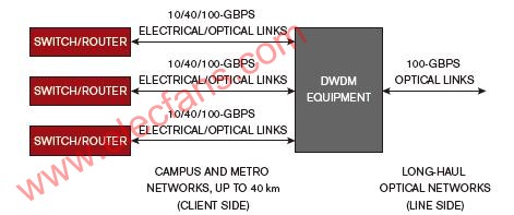 圖1,運(yùn)營(yíng)商用一個(gè)數(shù)據(jù)鏈路的線路端作城際間的長(zhǎng)距離傳輸。客戶端傳輸則用于連接園區(qū)和本地城市地區(qū)。