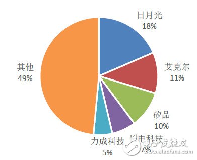根據(jù)Gartner數(shù)據(jù),2014年全球封裝市場(chǎng)271.3億美元,2015年-2020年維持5%的復(fù)合增長率。根據(jù)集邦科技數(shù)據(jù)顯示,2015年全球封裝測(cè)試份額日月光、艾克爾、矽品、長電科技和力成分別占據(jù)19%、11%、10%、7%和5%的市場(chǎng)份額。這個(gè)格局目前正在變化中,較為顯著的變化在于日月光與矽品的合并,兩者合并主要為抵抗來自于紫光集團(tuán)的收購,另一個(gè)變數(shù)在于艾克爾可能被大陸廠商收購。從未來趨勢(shì)來看,大陸廠商承接的芯片代工業(yè)務(wù)會(huì)逐步增多,下游的封裝測(cè)試向大陸轉(zhuǎn)移也在情理之中。