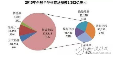 2015年全球半導(dǎo)體市場(chǎng)規(guī)模3352億美元,其中集成電路占比最高為81%,其余光電子、分立器件、傳感器等分別占據(jù)10%、6%和3%的份額;更進(jìn)一步看,集成電路細(xì)分下去發(fā)現(xiàn),邏輯電路、存儲(chǔ)器、微處理器和模擬電路等分別占27%、23%、18%和13%。